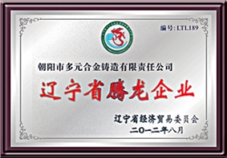 公司于2001年通過IS9001-2000質量管理體系認證,生產的多元牌高錳鋼鑄件于2005年榮獲"遼寧省名牌產品"稱號。